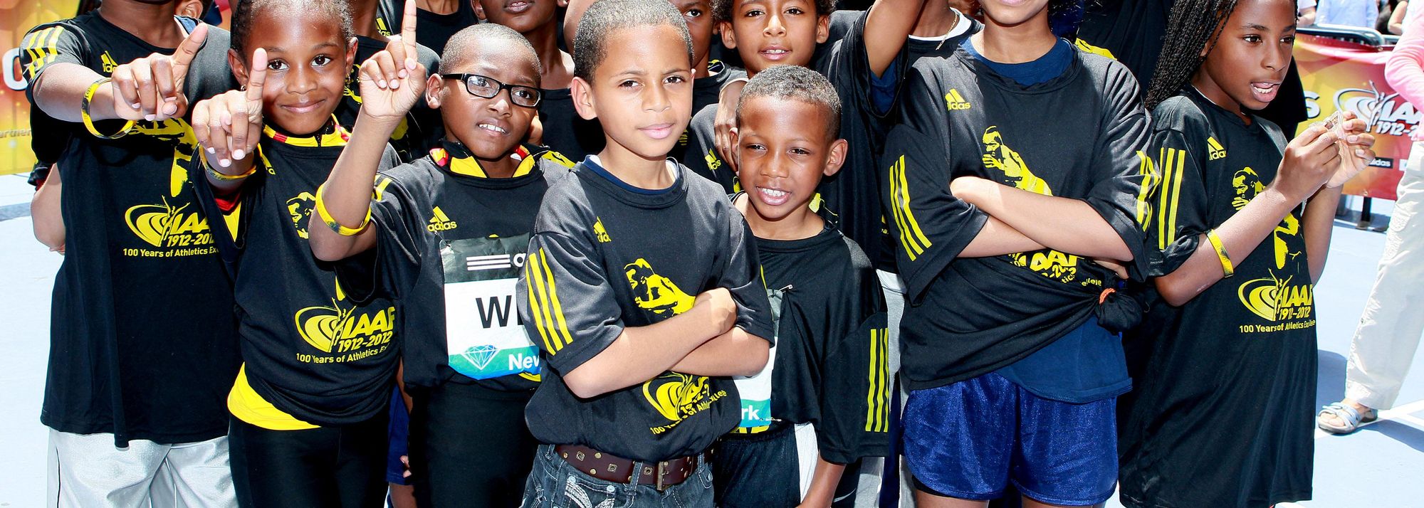 Dan O'Brien with young fans in New York City's Times Square during a '100 Kids - 100 metres - 100 years' relay event to mark the Centenary year of the IAAF, at which his inclusion into the IAAF Hall of Fame was announced. (© Victah Sailer)