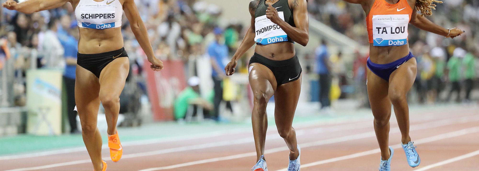 Dafne Schippers, Elaine Thompson and Marie-Josee Ta Lou in action at the Diamond League meeting in Doha (© AFP / Getty Images)
