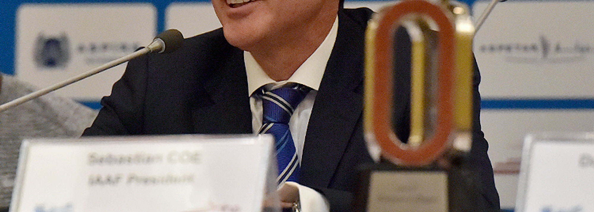 IAAF President Sebastian Coe at the pre-meeting press conference for the 2016 IAAF Diamond League meeting in Doha (© Hasse Sjogren)