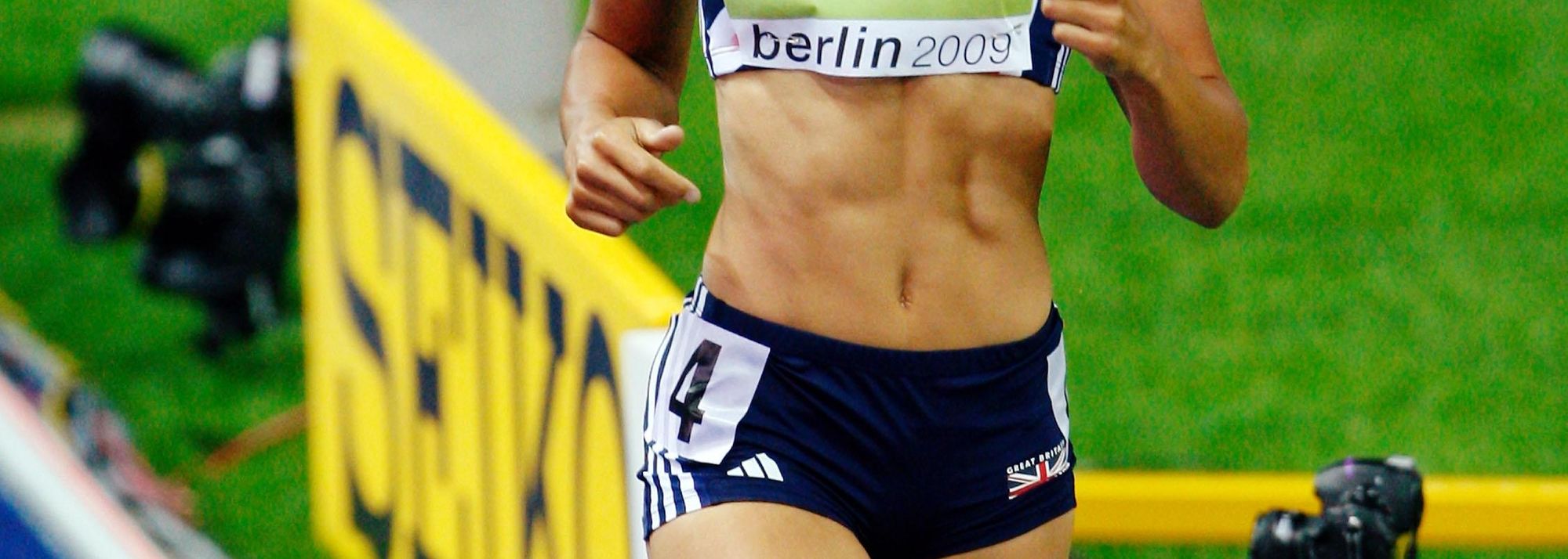 Jessica Ennis crosses the line to win the heptathlon at the 2009 IAAF World Championships in Berlin (© Getty Images)
