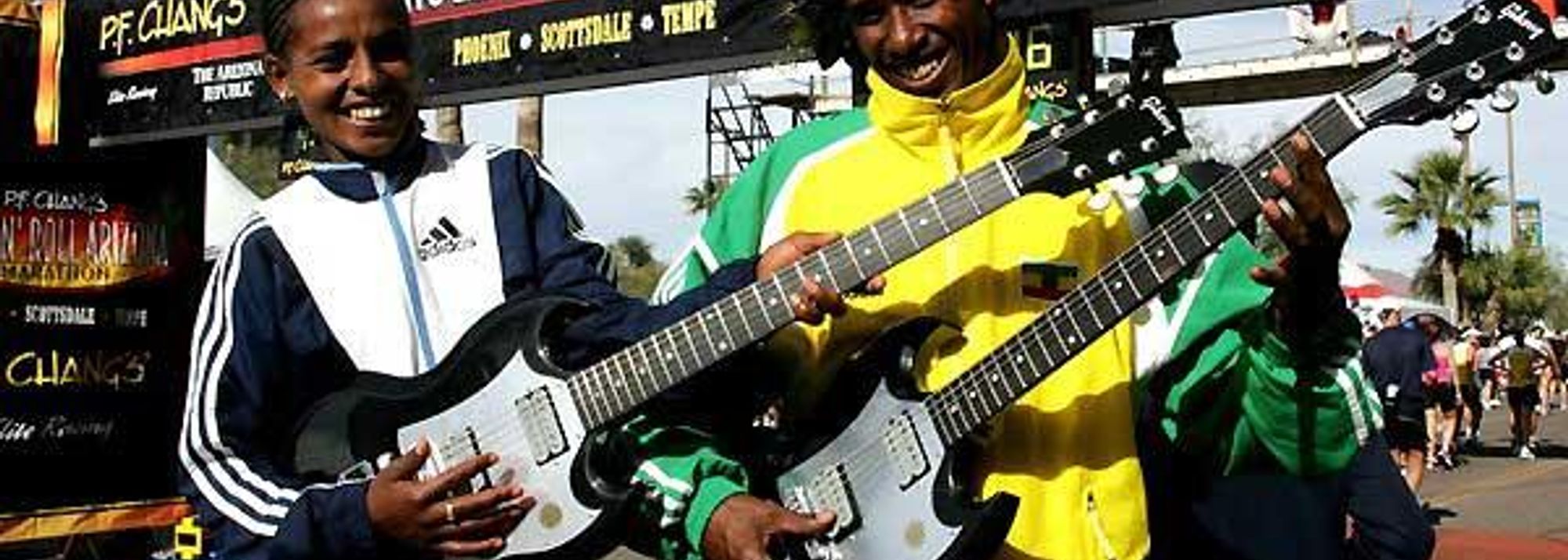 Shitaye Gemechu and Terefe Yae pose with guitars after their victories in the Rock n'Roll marathon (© Victah Sailer)