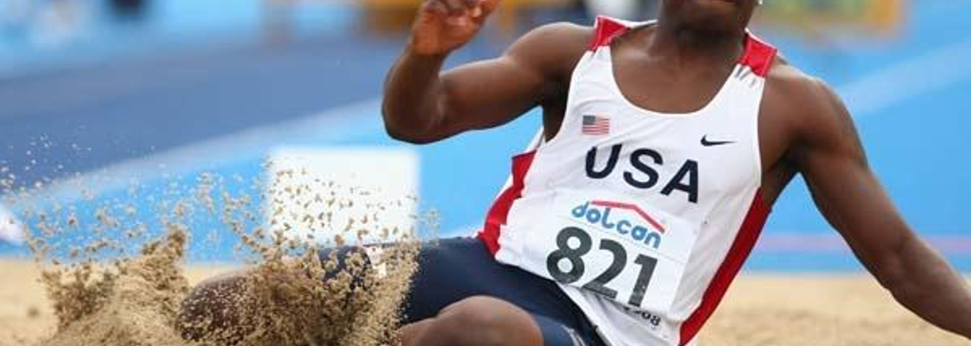 Marquise Goodwin of USA on his way to winning the gold medal in the Men's Long Jump (© Getty Images)