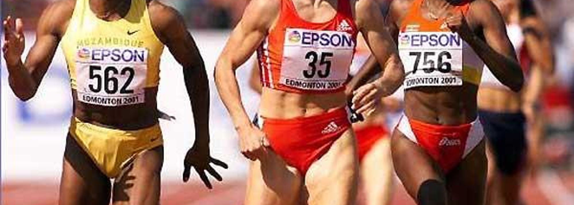 Stephanie Graf (centre) running to World silver, next to eventual winner Maria Mutola (left) in Edmnonton 2001 (© Getty Images)