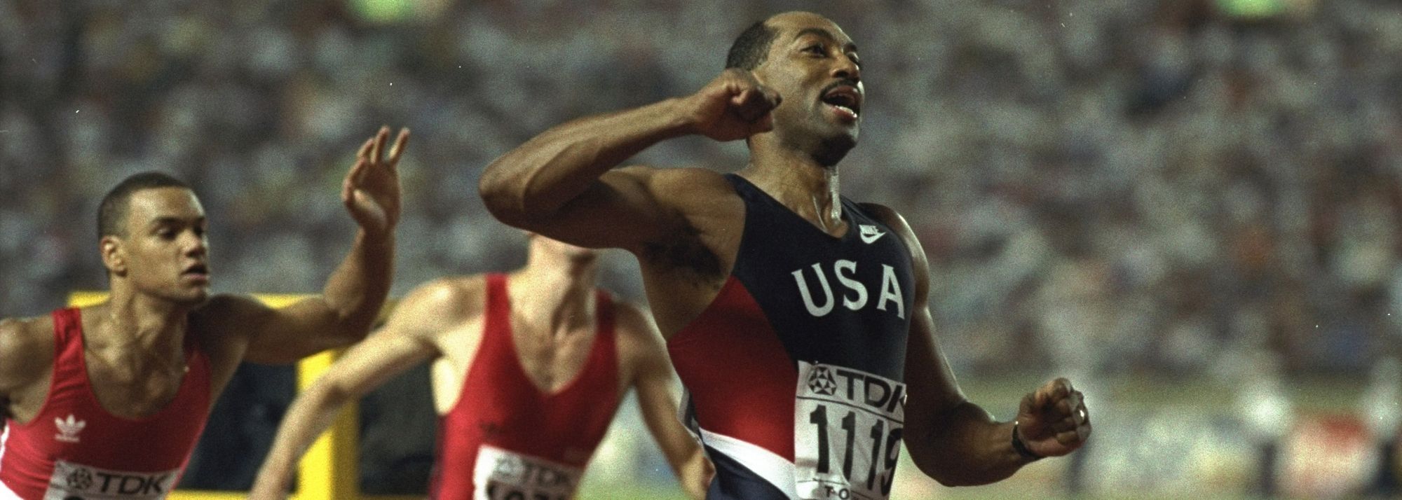 Greg Foster wins his third world 110m hurdles title in Tokyo in 1991 (© Allsport / Getty Images)