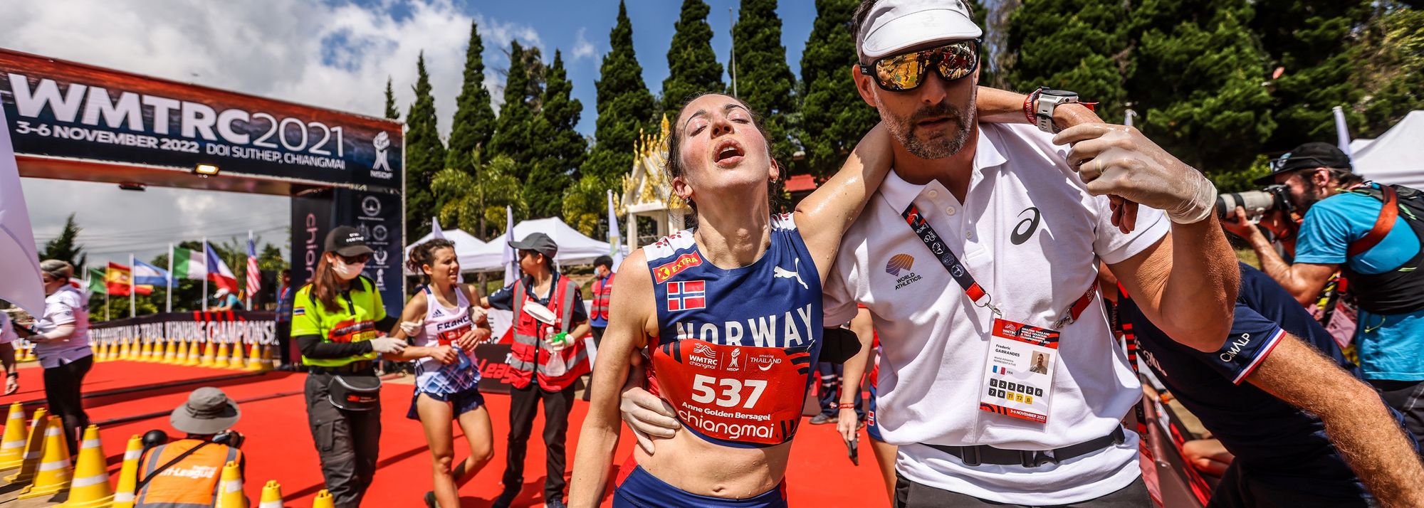 Frederic Garrandes helps an athlete at the finish of the World Mountain and Trail Running Championships in Chiang Mai (© Organisers)