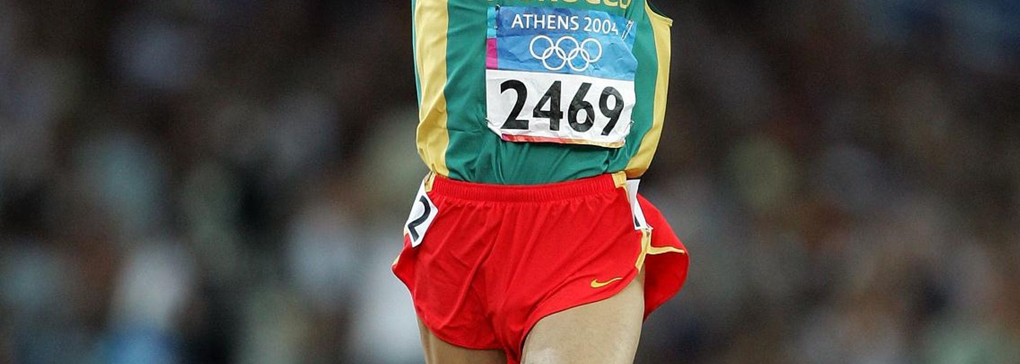Hicham El Guerrouj after his 5000m triumph at the 2004 Olympics, his second gold medal of the Athens Games (© Getty Images)
