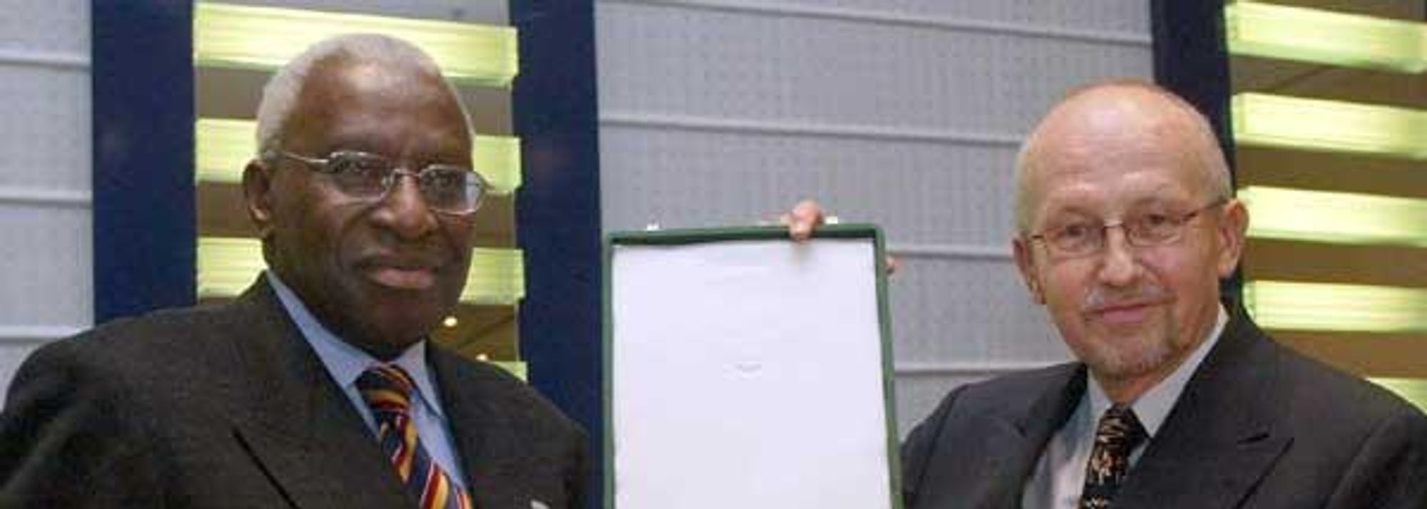 IAAF President Lamine Diack presents the IAAF Plaque of Merit to Horst Milde (© IAAF)
