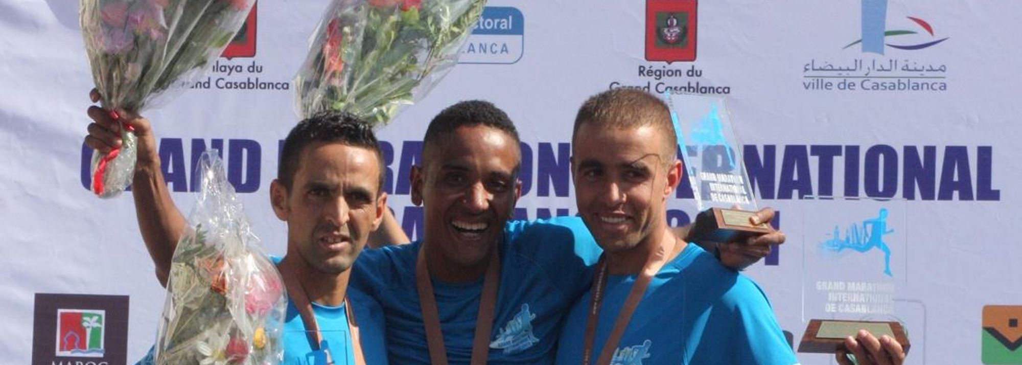 Aziz Naji Idrissi (c) on the Casablanca Marathon podium (© Mohammed Benchrif)