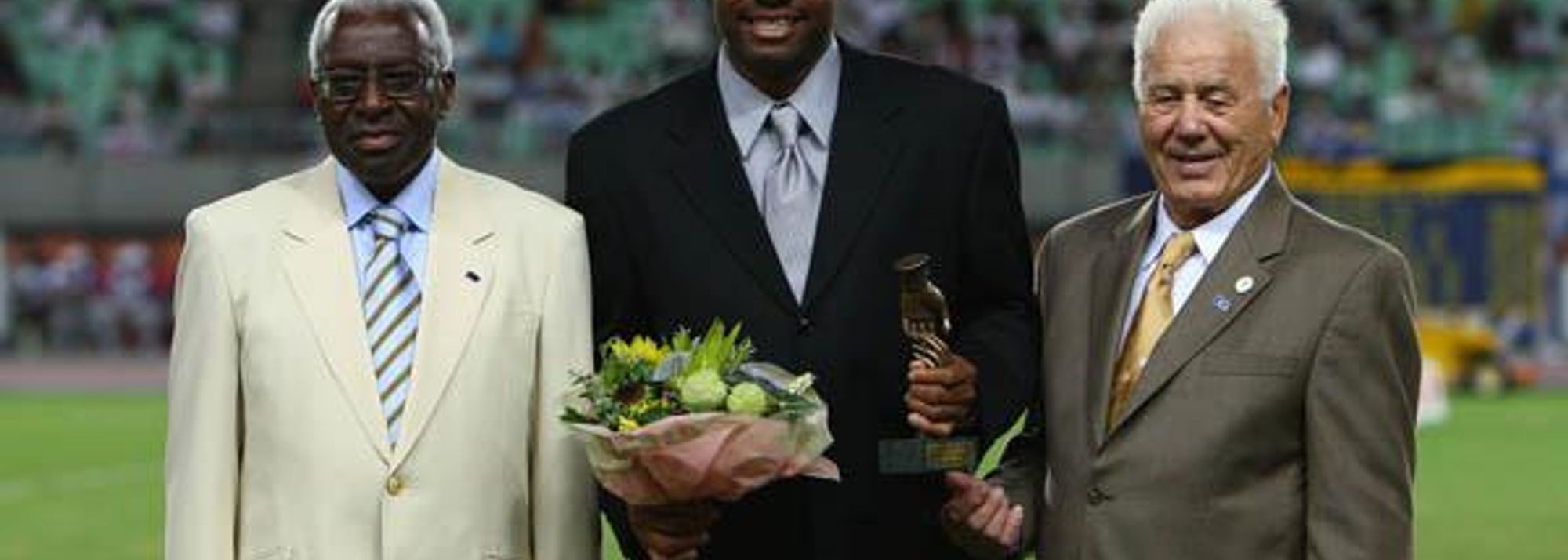 Mike Powell (centre) is awarded the Fair Play award by IAAF President Lamine Diack and former World record holder Laszlo Tabori (© Getty Images)