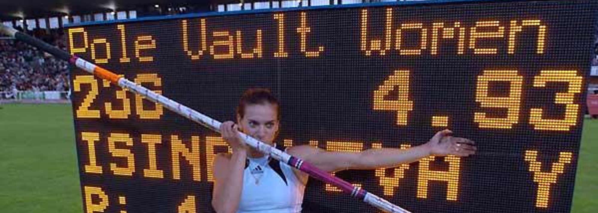Yelena Isinbayeva in front of her World record scoreboard in Lausanne (© Hasse Sjögren)