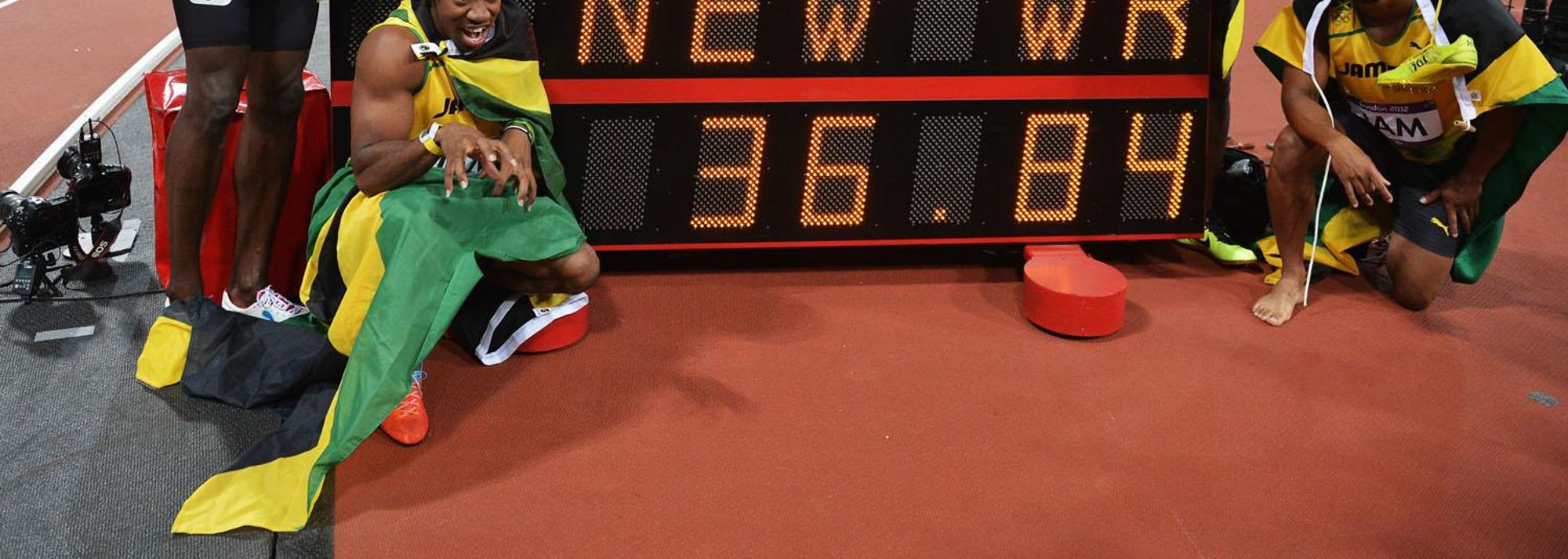 Winning Jamaican team: Usain Bolt, Yohan Blake, Michael Frater and Nesta Carter next to the clock showing the new world record of 36.84 in the Men's 4 x 100m Relay Final of the London 2012 Olympic Games on August 11, 2012 (© Getty Images)