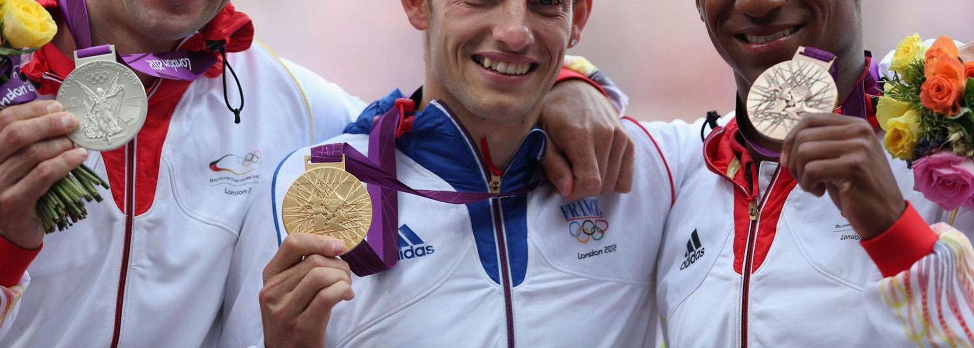 Silver medalist Bjorn Otto of Germany, gold medalist Renaud Lavillenie of France and bronze medalist Raphael Holzdeppe of Germany pose on the podium during the medal ceremony for the Men's Pole Vault of the London 2012 Olympic Games on August 11, 2012 (© Getty Images)