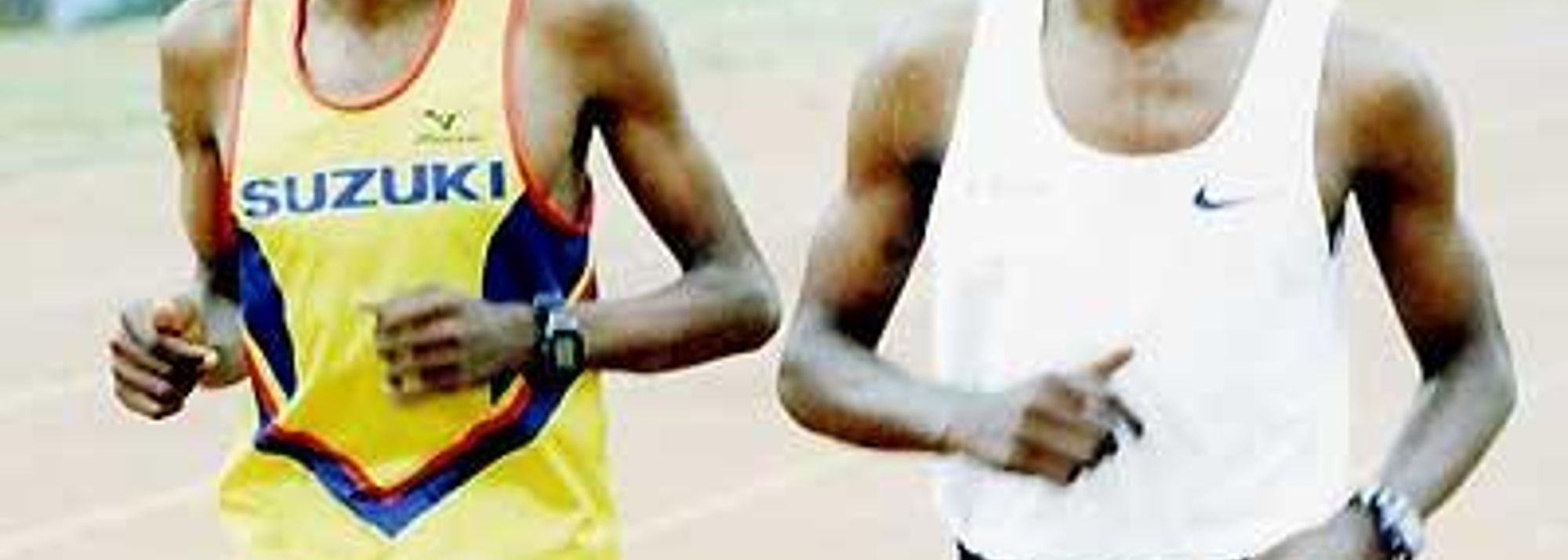 10,000m runners Martin Matathi (l) and Charles Kamathi (r) doing intervals at the training camp in Moi International training centre (© Omulo Okoth)