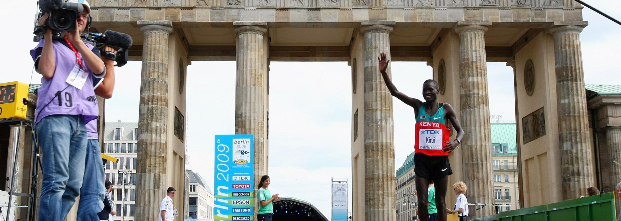 Abel Kirui of Kenya crosses the finish line at the Bradenburg Gate in Berlin to win the gold in the men's Marathon with a Championship Record (© Getty Images)