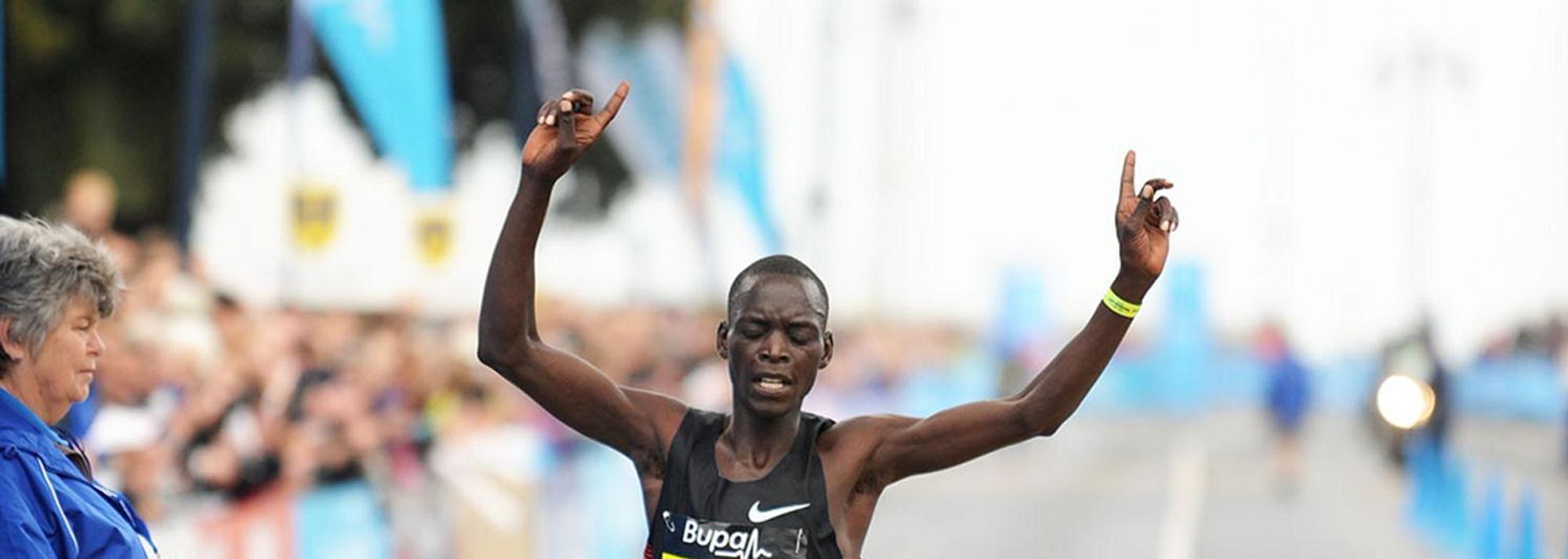 Leonard Patrick Komon breaking the tape at the Great South Run (© Mark Shearman)