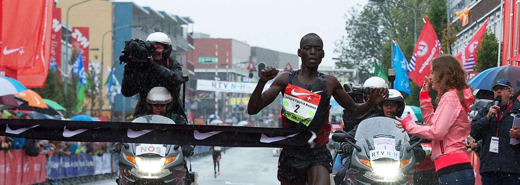 Komon is known as a very start starter and in Amsterdam he went out very fast as usual. Eritrean Samuel Tsegay was the only runner who could follow, and the two passed the five-kilometre marker in a very fast 13:13. In pouring rain the two went on and after 7500 metres Tsegay last contact. Komon went on and reached 10Km in 27:17. Then the Kenyan slowed somewhat giving Tsega the chance to regain ground. But at the moment the Eritrean was with Komon the Kenyan accelerated and opened a gap again passing al the women, who started 5:46 earlier. At 15Km Komon was clocked in 41:26 with Tsegay four seconds back. In the final kilometre Komon took nine seconds on his last opponent who finished second in 44:38.