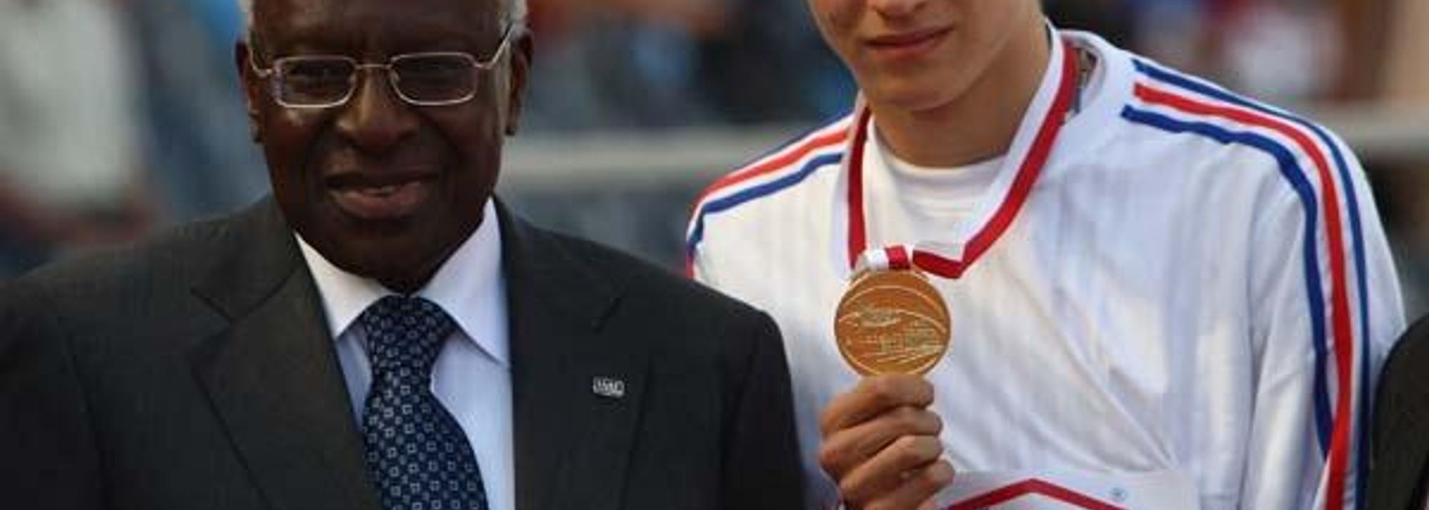 Christophe Lemaitre of France receives his 200m gold medal from IAAF President Lamine Diack (© Getty Images)