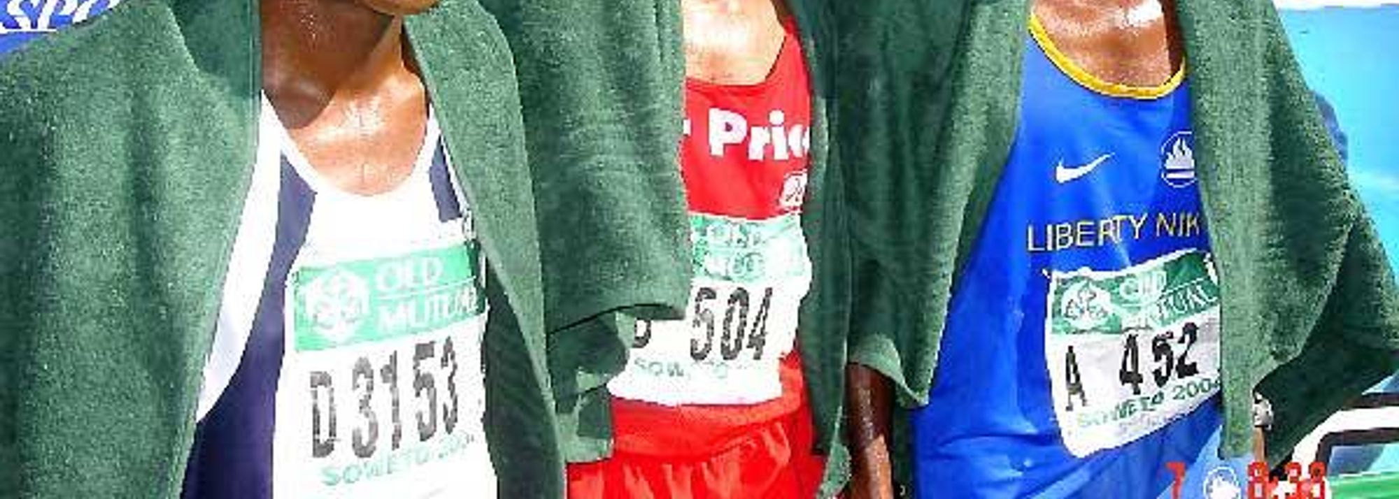 2004 Soweto Marathon - Left: Jumani Boki (Tan), 3rd; Middle: Mabuthile Lebopo (Lesotho), 1st; Right - Elijah Mutandiro(Zim), second. (© Ouma)