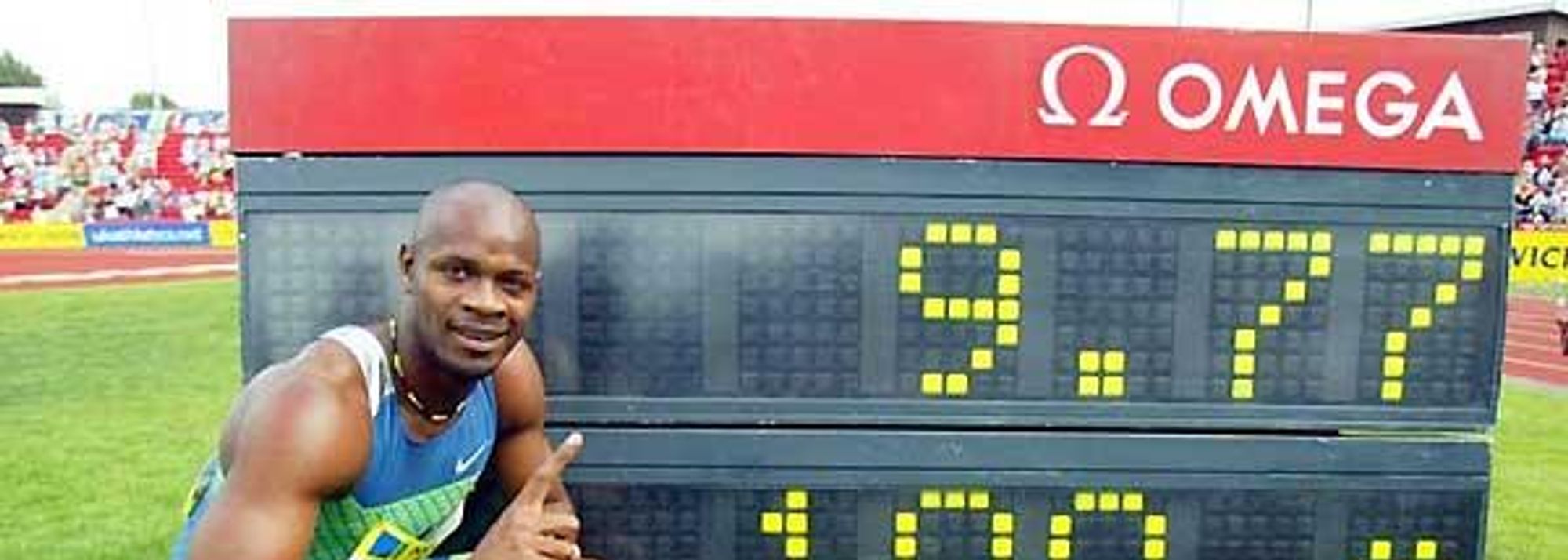Asafa Powell crouches next to his World record clock in Gateshead (© Mark Shearman)