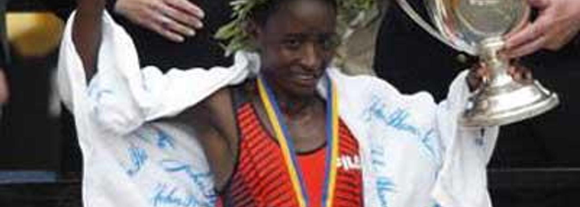 Margaret Okayo (KEN), celebrates after winning the 2002 Boston Marathon (© Getty Images)