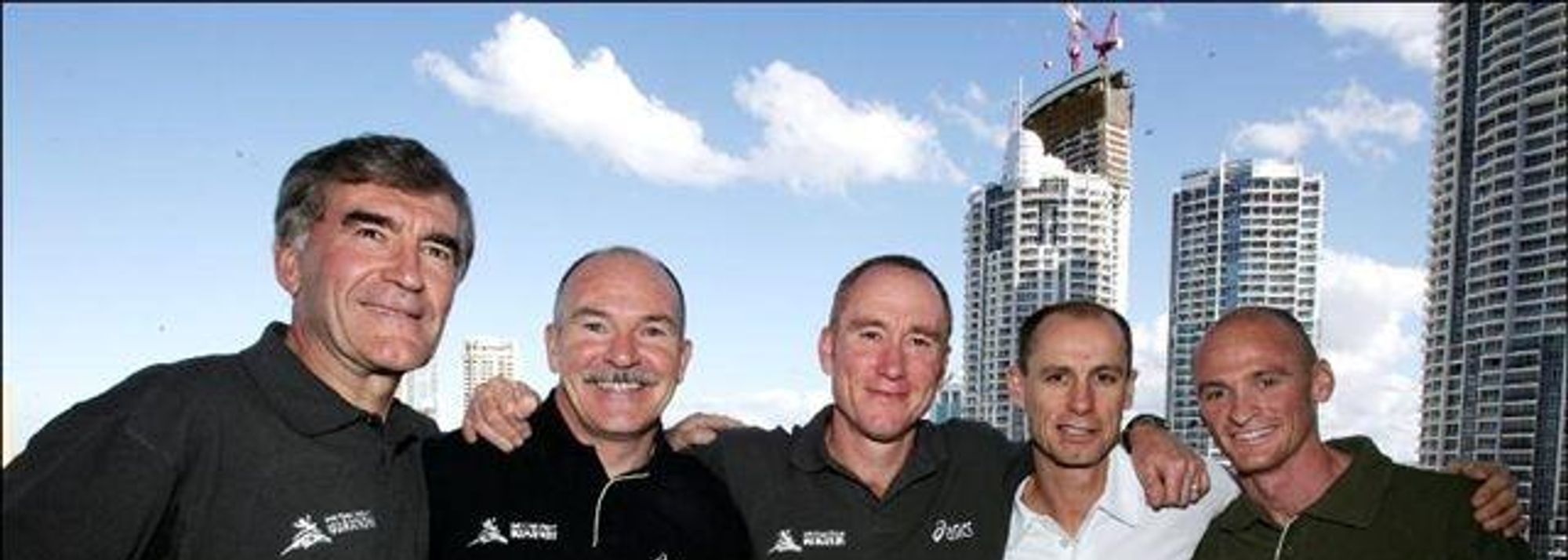 A 2006 photo of a gathering of the five fastest Australian marathoners of all time (from left): Derek Clayton, Robert de Castella, Pat Carroll, Steve Moneghetti and Lee Troop (© Adam Head)