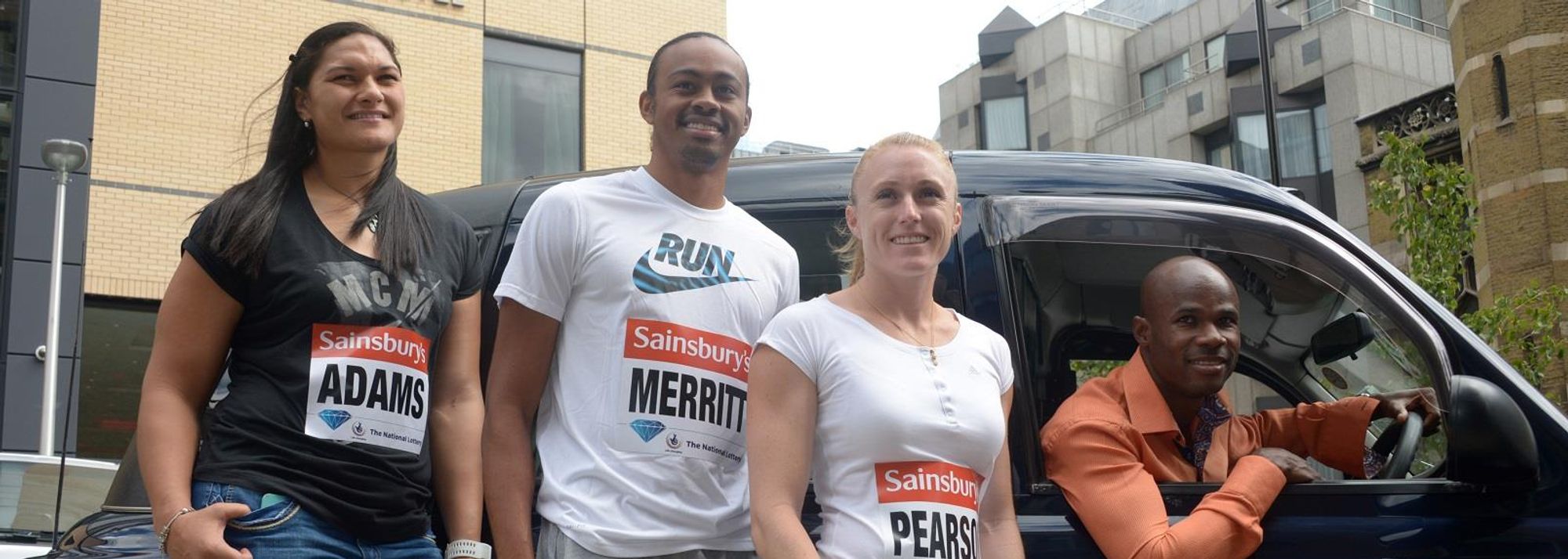 Valerie Adams, Aries Merritt, Sally Pearson & Kim Collins before the 2013 IAAF Diamond League in London (© Kirby Lee)