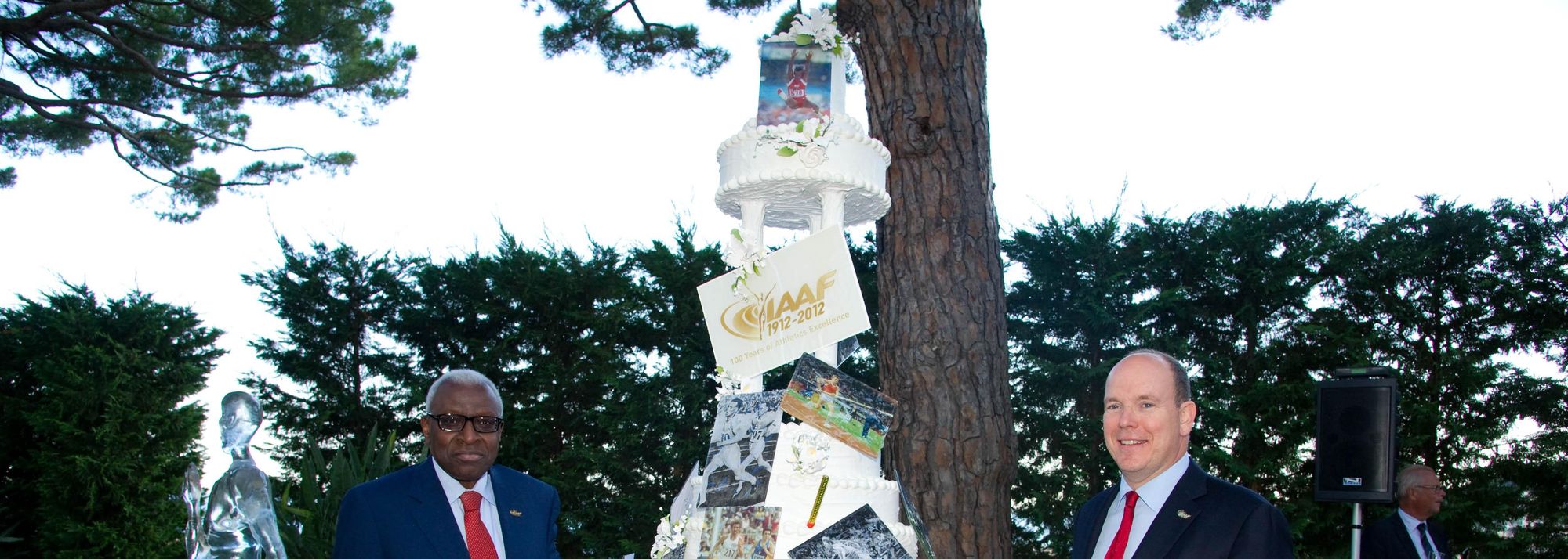 IAAF President Lamine Diack and HSH Prince Albert II of Monaco with the IAAF Centenary Birthday cake (© Gaëtan Luci / Palais princier)