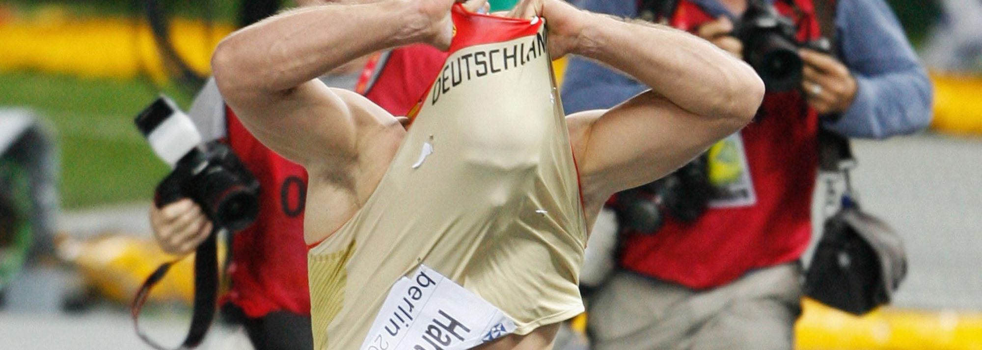 On Tuesday Berlino, the mascot of the championships, had accidentally knocked over Nerius in a moment of great joy, this time there was no way of bringing Robert Harting to the ground. After ripping his shirt in pieces as he did two years ago, when he had taken a surprising silver medal in Osaka, he simply took the bear as if it had been a small teddy and lifted him upside down on his back! While Berlino was struggeling Harting was celebrating.