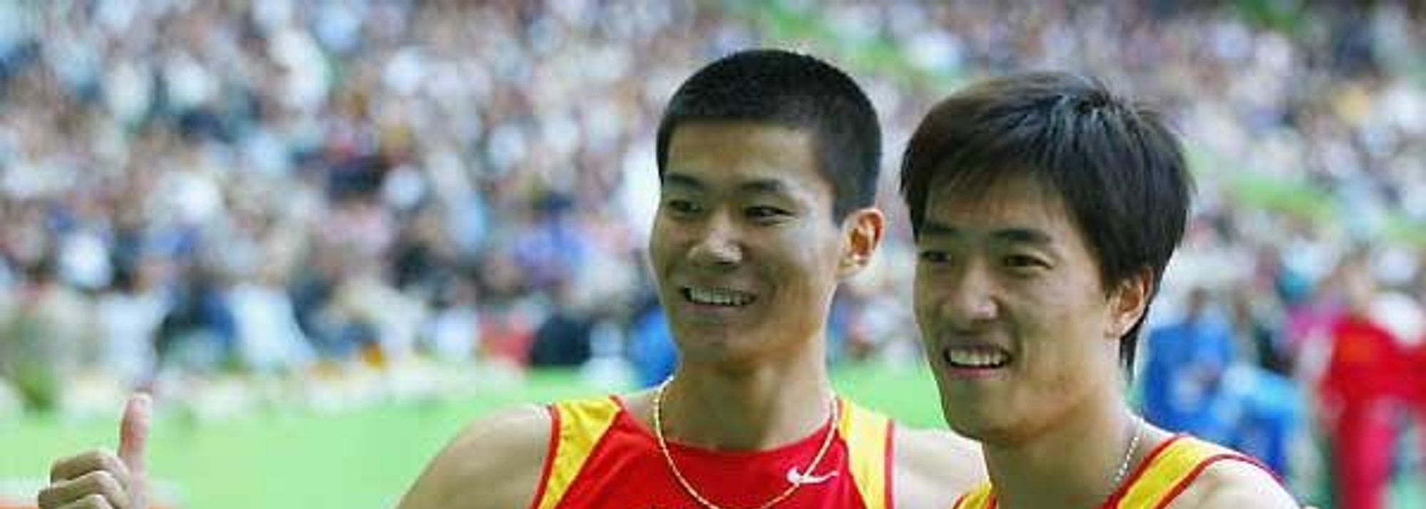 Shi Dongpeng (l) with Liu Xiang (r) - after their 7th and 3rd place finishes in the 2003 World Champs 110mH Final (© Getty Images)