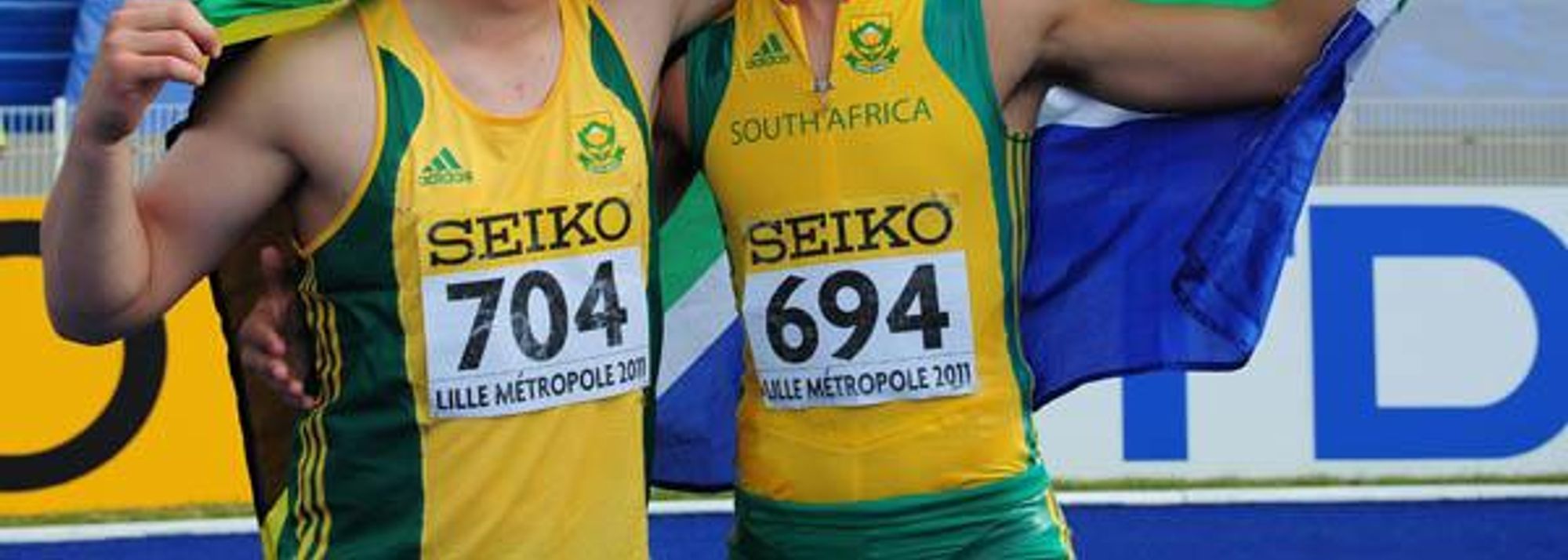 Gold medalist Reinhard VAN ZYL (l) and Silver medalist Morne MOOLMAN (RSA) pose with the flag after the Boys Javelin final - Day Five - WYC Lille 2011 (© Getty Images)
