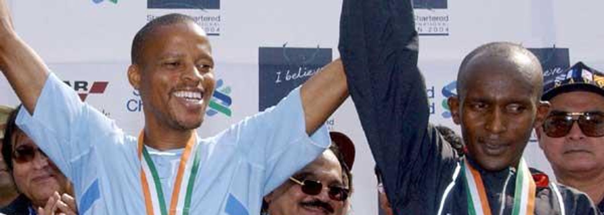Julius Sugut of Kenya (right) has his arm raised by Hendrick Ramaala of South Africa after the 2004 Mumbai race (© AFP/Getty Images)
