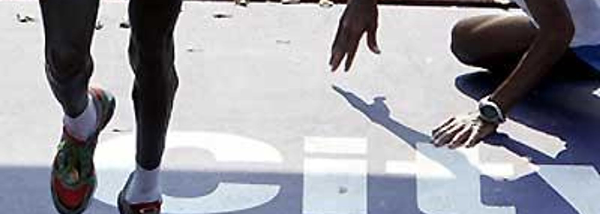 Paul Tergat wins the ING New York Marathon as defending champion Hendrick Ramaala falls to the ground (© Getty Images)