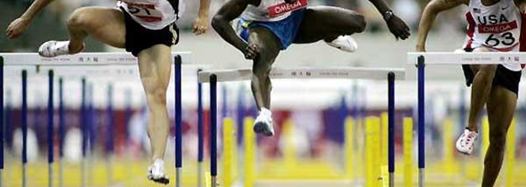 Liu Xiang (left) defeats Allen Johnson (centre) in the Golden Grand Prix, Shanghai (© AFP/Getty Images)