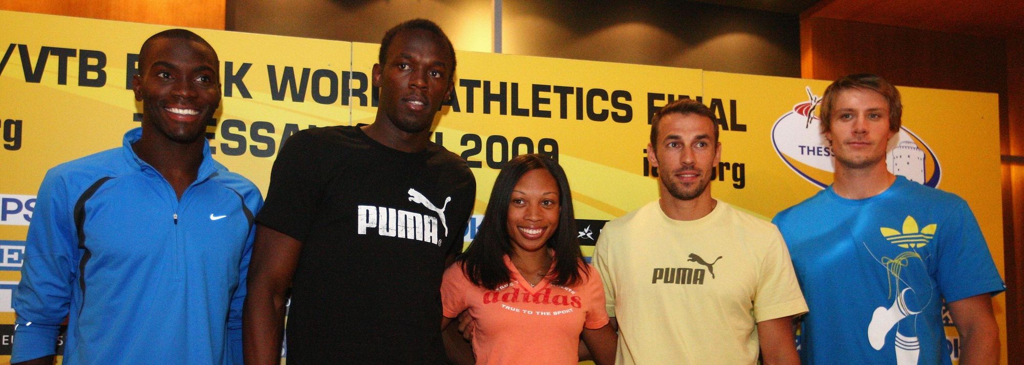 (L to R) Kerron Clement of USA, Usain Bolt of Jamaica, Allyson Felix of the USA, Periklis Iakovakis of Greece, and Andreas Thorkildsen of Norway at the WAF press conference in Thessaloniki (© Getty Images)
