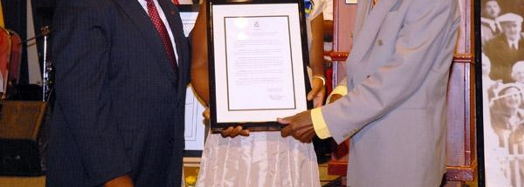 Thomas Augustus (Tommy) Robinson (r) being presented with a framed copy of the Prime Minister Hubert Ingraham's Proclamation declaring Friday, 24 July as ‘Tommy Robinson Day’. Committee Member Sandra Smith (middle) (© David Charlton)
