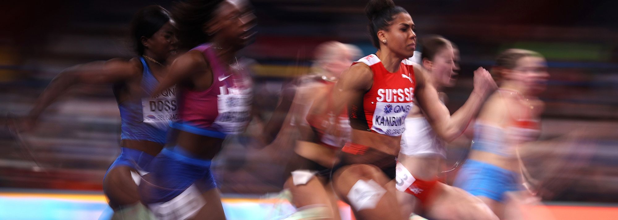 Mujinga Kambundji in action at the World Athletics Indoor Championships Belgrade 22 (© Getty Images)