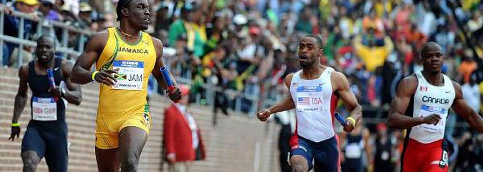 Dwight Thomas (l) anchoring the victorious Jamaican 4x100m Relay at the Penn Relays. U.S. anchor Tyson Gay was fourth. (© Kirby Lee)