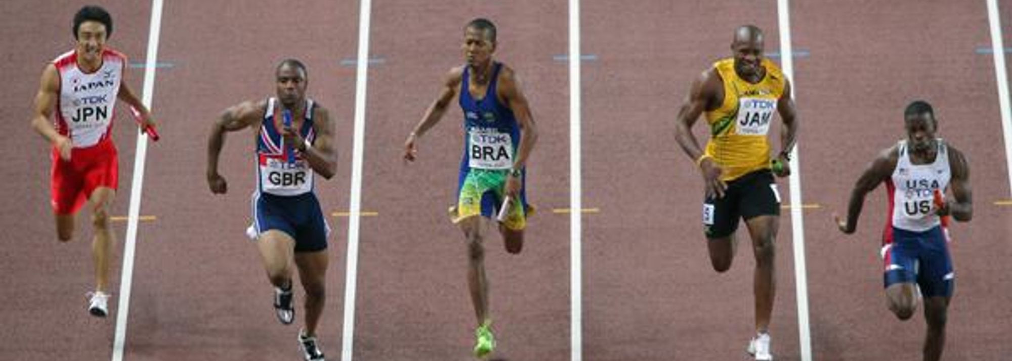 Nobuharu Asahara of Japan, Mark Lewis-Francis of GBR, Sandro Viana of Brazil, Asafa Powell of Jamaica and Leroy Dixon of USA during the Men's 4 x 100m Relay Final (© Getty Images)