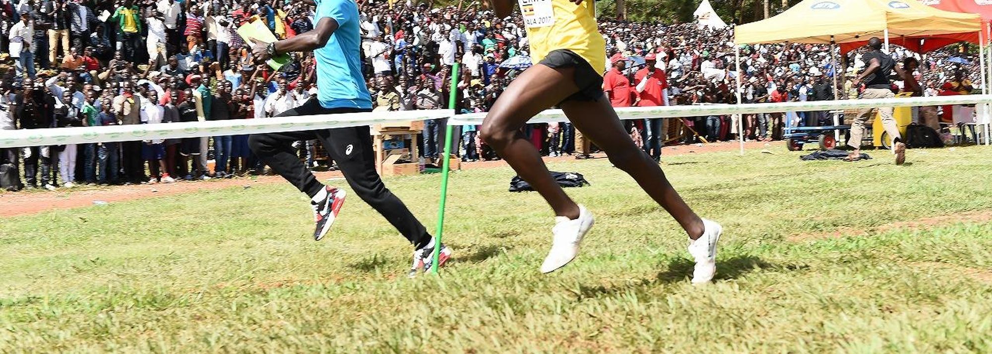 A Ugandan fan runs alongside Jacob Kiplimo during the U20 men's race at the IAAF World Cross Country Championships Kampala 2017 (© Jiro Mochizuki)