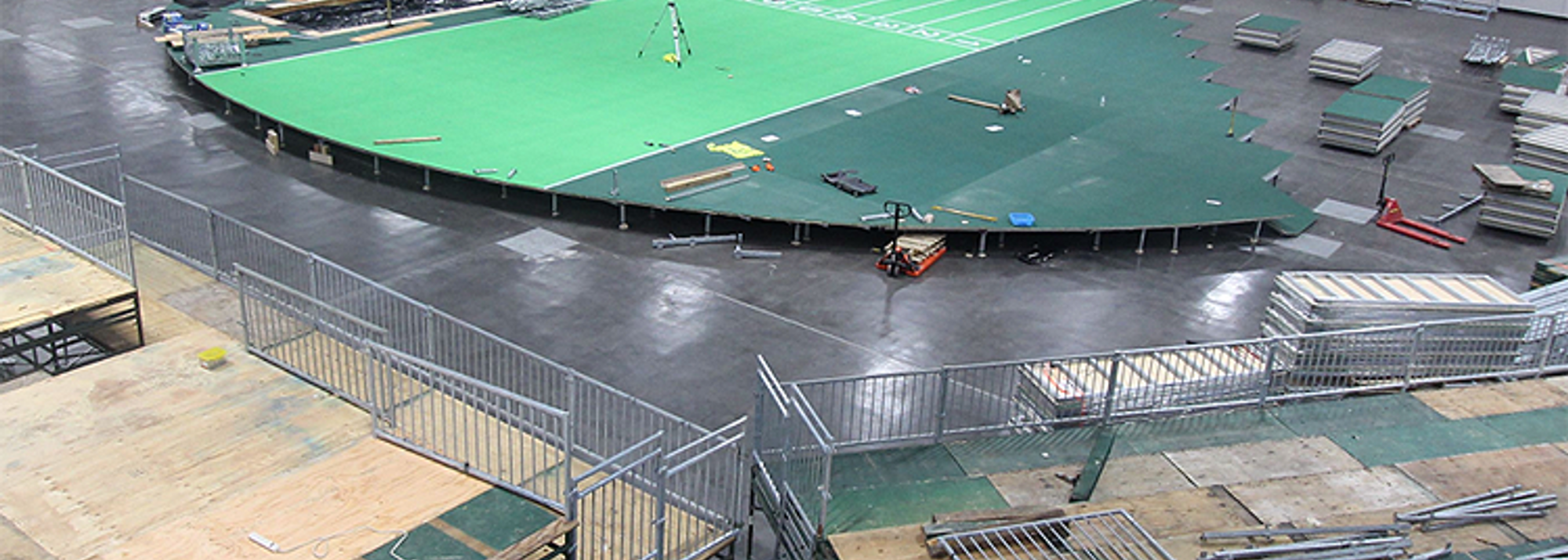 Construction of the track for the IAAF World Indoor Championships Portland 2016 (© Portland 2016)