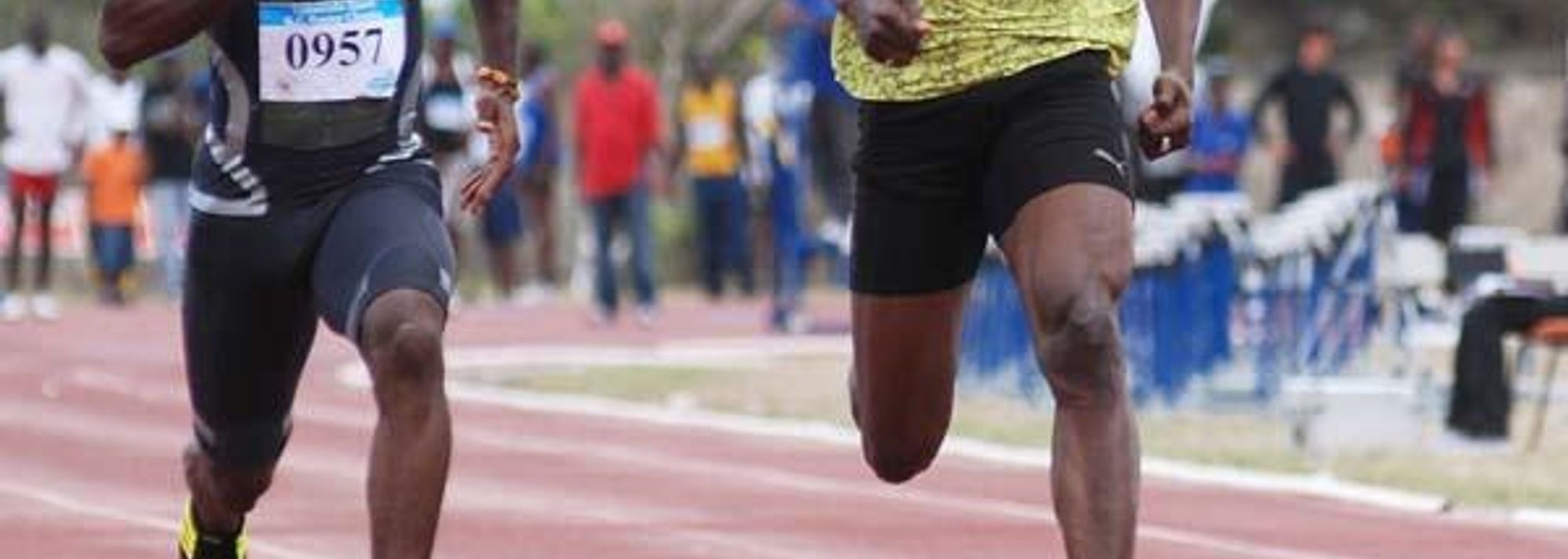 Jamaica's Usain Bolt (right), the world's fastest man, and Daniel Bailey of Antigua and Barbuda look at each other during their 100m race on Saturday (14) at the 2009 G.C. Foster College meet (© Anthony Foster)