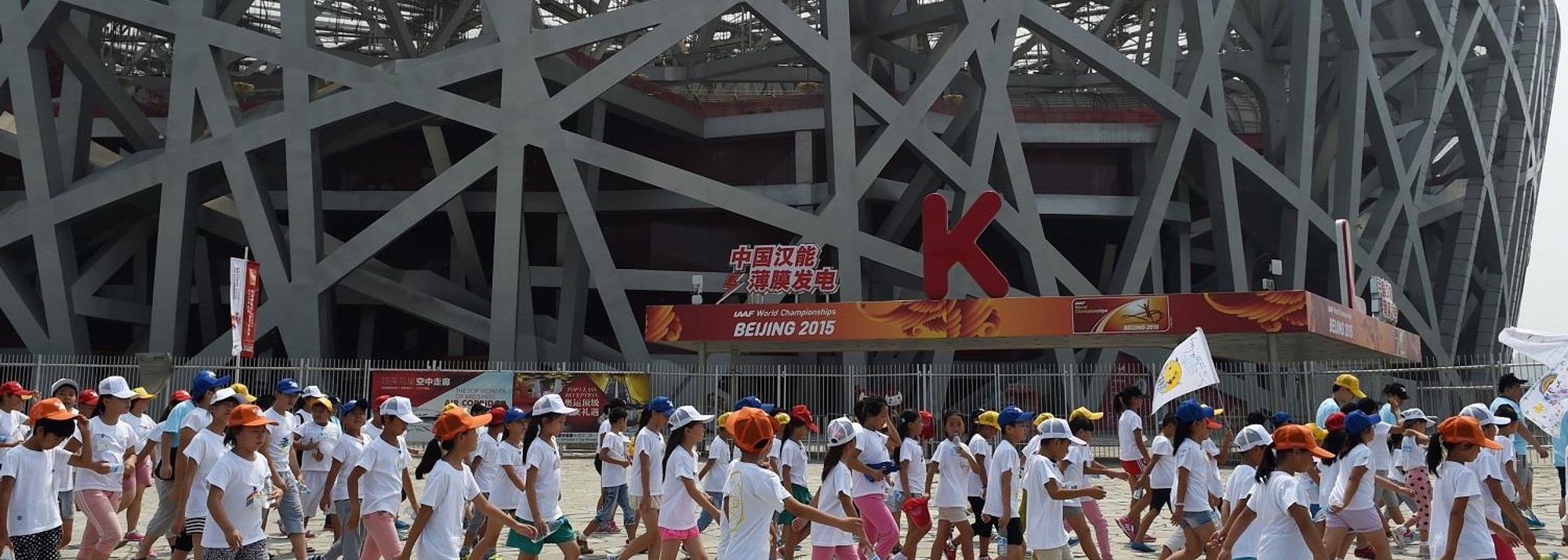 School children outside the Bird's Nest stadium with a week to go to the IAAF World Championships, Beijing 2015 (© AFP / Getty Images)