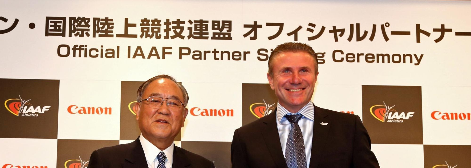 Fujio Mitarai, Chairman and CEO of Canon Inc, and Sergey Bubka, IAAF Vice-President at the Canon Official IAAF Partner signing ceremony in Japan (© Canon)