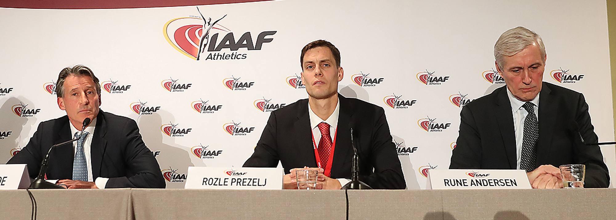 IAAF President Sebastian Coe, IAAF Athletes Commission chair Rozle Prezelj and Rune Andersen, the independent chairperson of the IAAF Taskforce, at the press conference following the 207th IAAF Council Meeting in Monaco (© Giancarlo Colombo / IAAF)