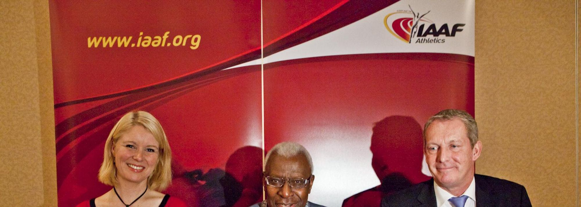 IAAF President Lamine Diack (c), with Copenhagen Mayor of Sport and Culture Pia Allerslev, and Lars Lundon after the city's winning bid was announced to host the 2014 IAAF World Half Marathon Championships (© Philippe Fitte)