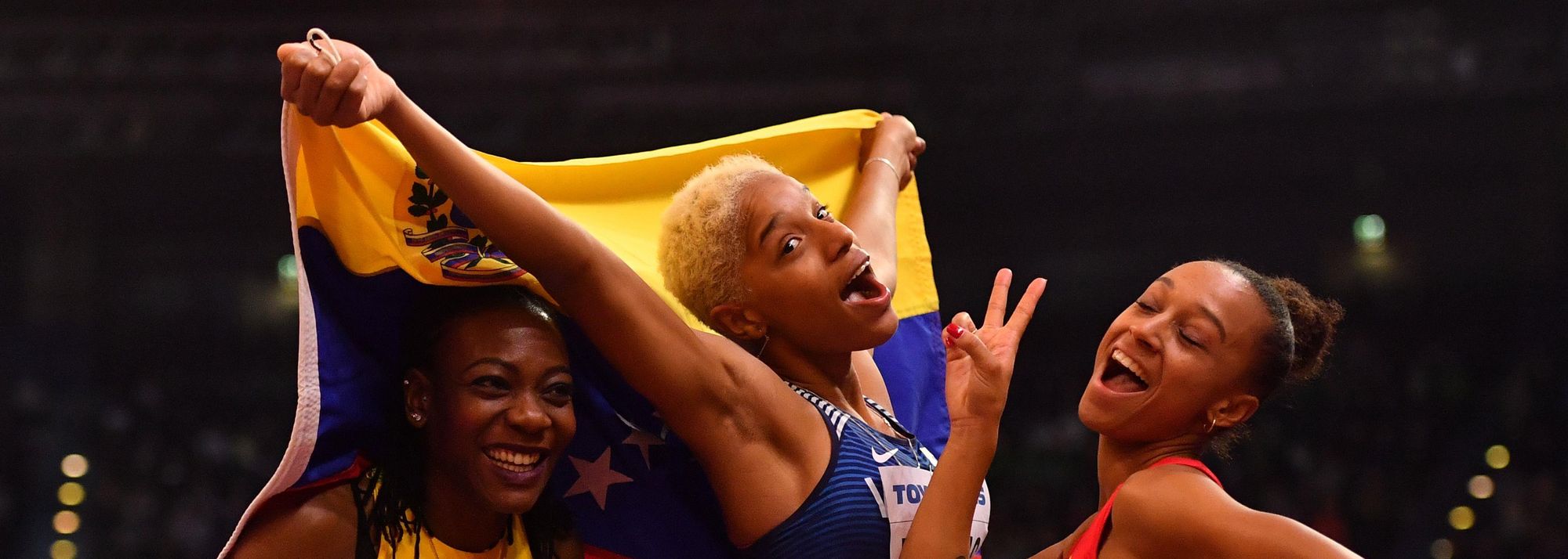 Kimberly Williams, Yulimar Rojas and Ana Peleteiro celebrate their top-three finish at the IAAF World Indoor Championships Birmingham 2018 (© Getty Images)