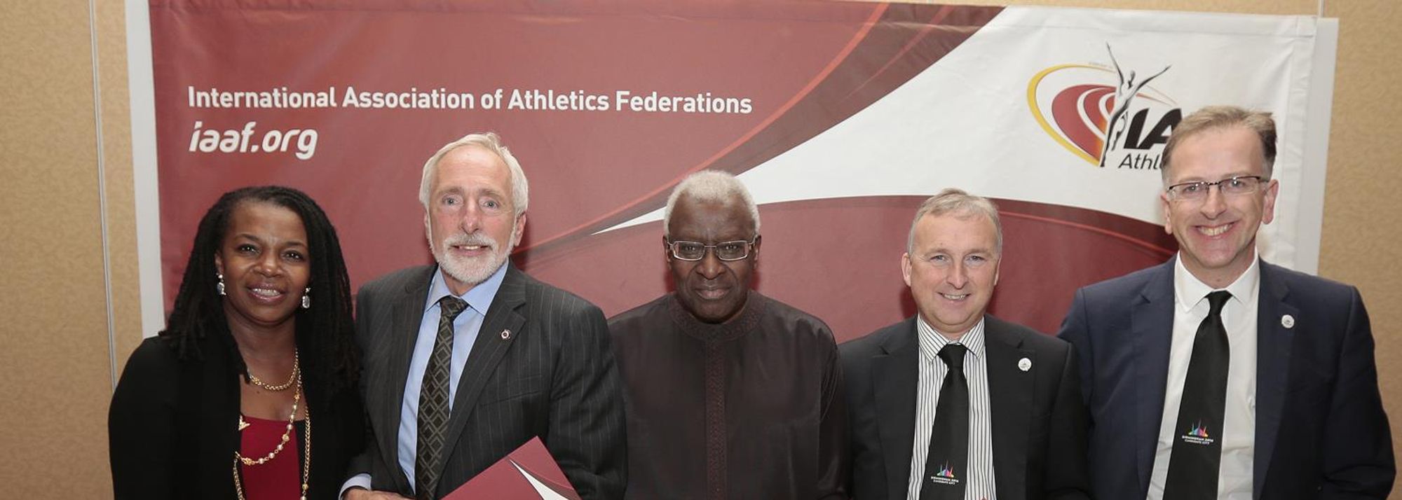 IAAF President Lamine Diack with heads of the delegations from Portland and Birmingham (© IAAF)