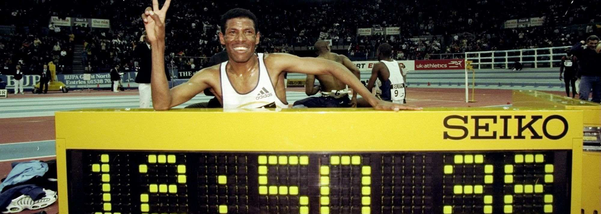 Haile Gebrselassie after breaking the world indoor 5000m record at the 1999 Birmingham indoor meeting (© Getty Images)