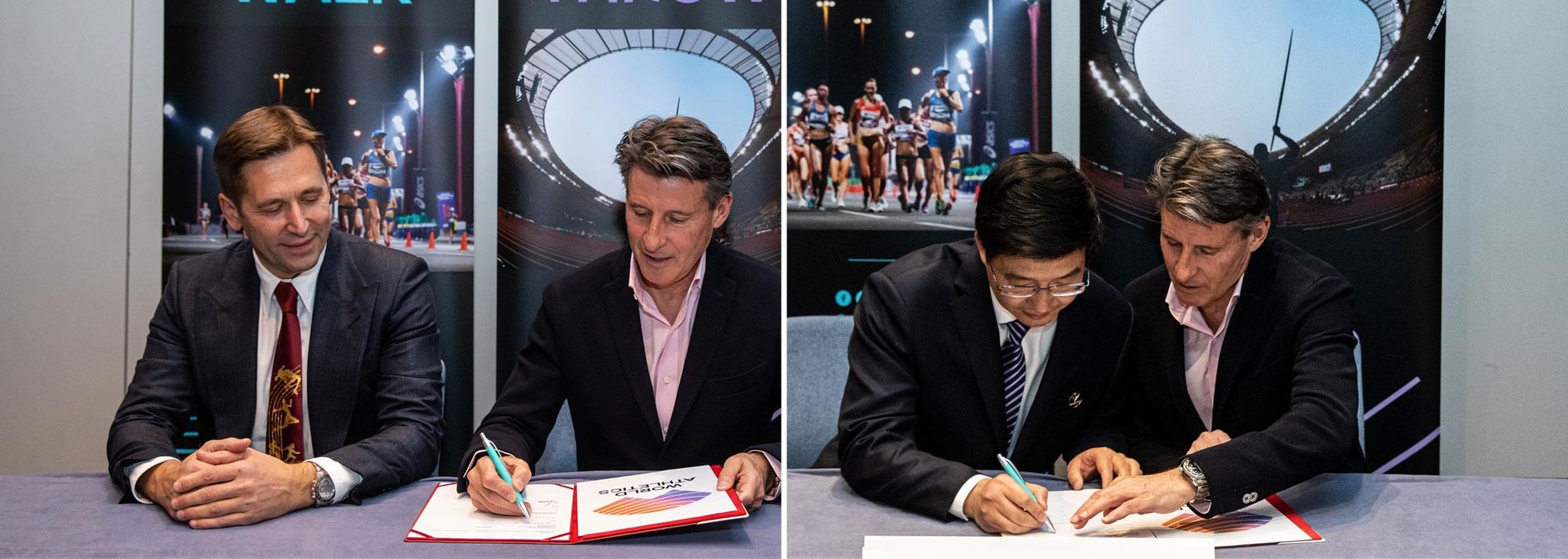 World Athletics President Sebastian Coe with Serbian Athletics Federation President Veselin Jevrosimovic (left) and Yangzhou Vice Mayor Yu Ting (right) (© Philippe Fitte)