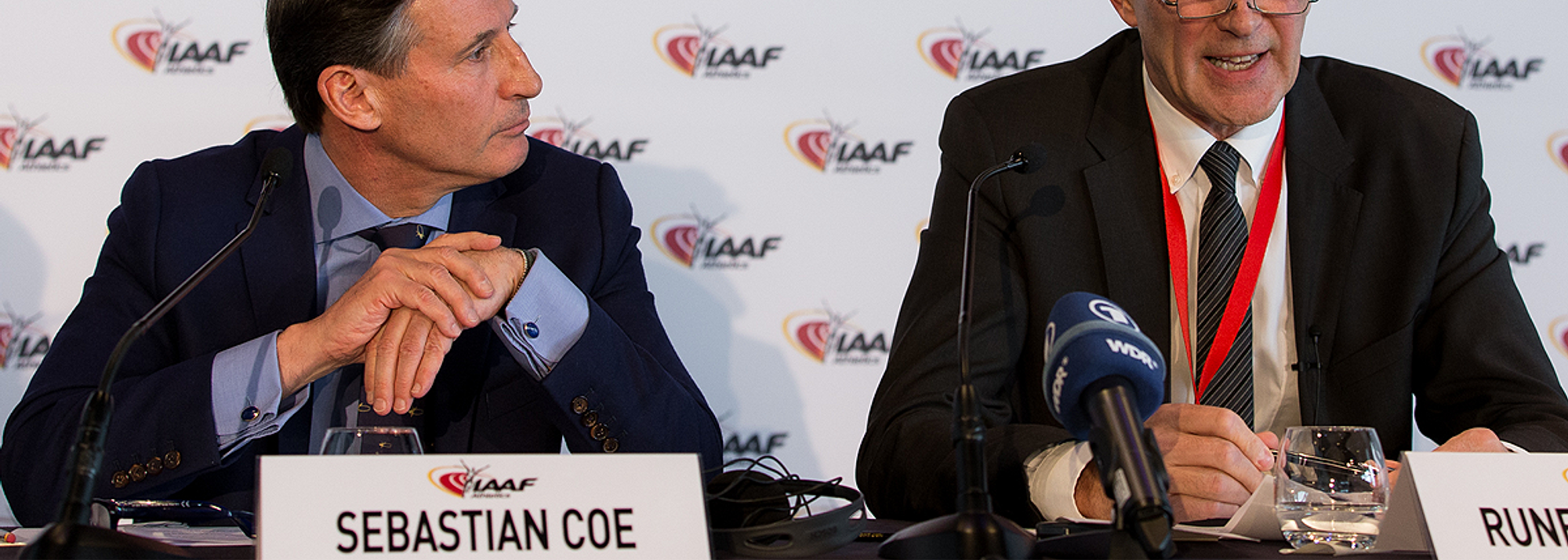 IAAF President Sebastian Coe and IAAF Taskforce independent chair Rune Andersen at the press conference following the 203rd IAAF Council Meeting in Monaco (© Philippe Fitte / IAAF)